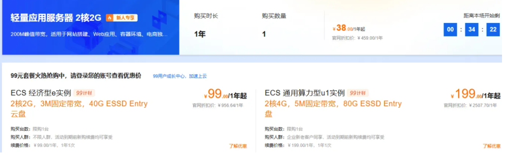 爆款2:ECS云服务器2核2G、3M带宽,99元1年