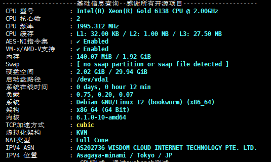 可以看到CPU使用的是 gold6138 基本频率为2.00GHz