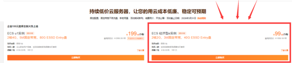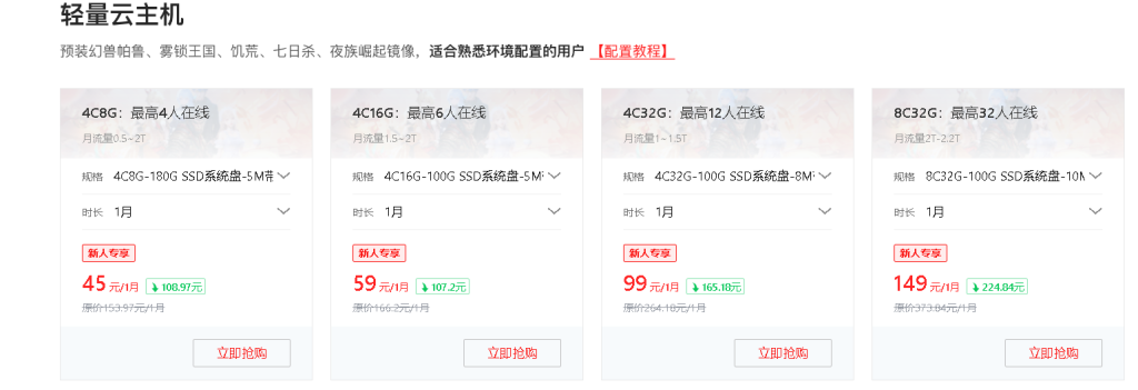 博客建站、小型游戏(我的世界、饥荒):2核2G 99,续费三年297,4G仅支持企业用户购买。