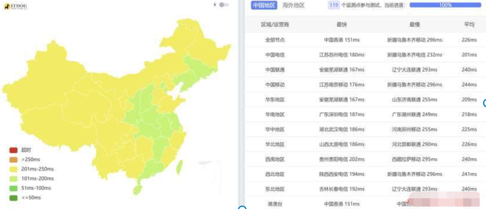 看看全国三网Ping平均延迟情况:
