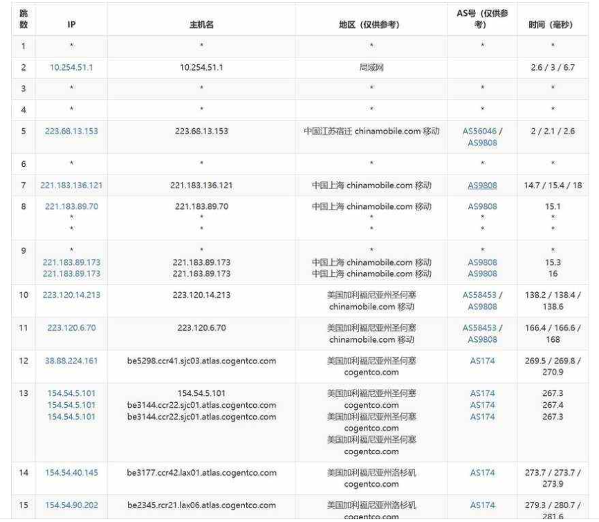 移动去程路由是从上海网口出去,经过圣何塞节点后到达洛杉矶机房。