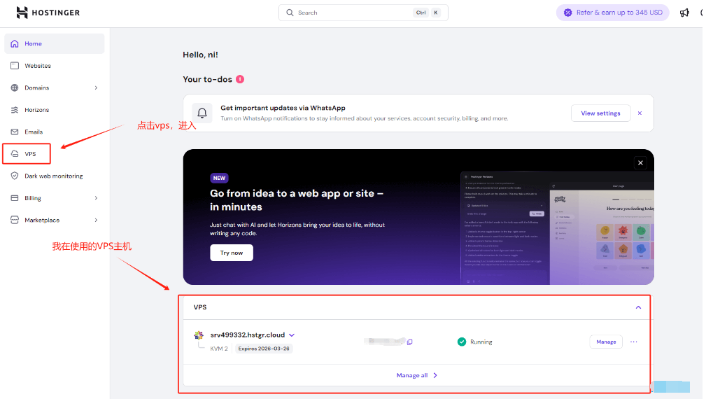 完成购买后,回到我们hostinger的管理后台,再点击左侧“vps”就能看到我们刚才购买的那台主机了。