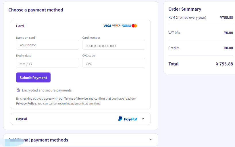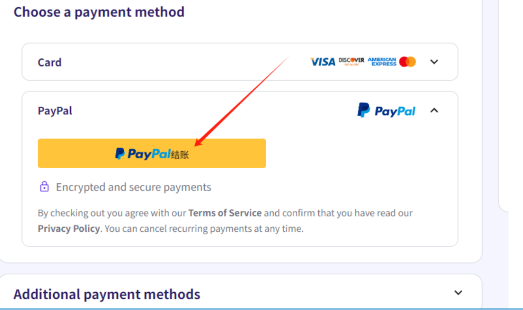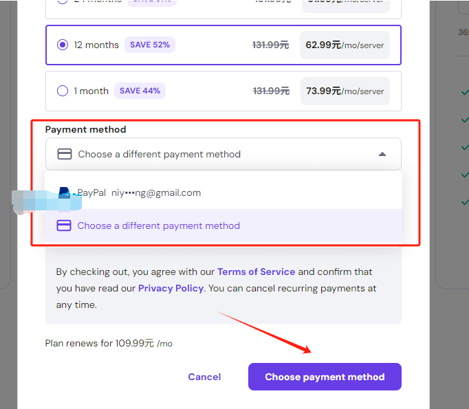 下一步就是选择支付方式:我因为用paypal买过vps主机,所以直接默认了用paypal支付了。