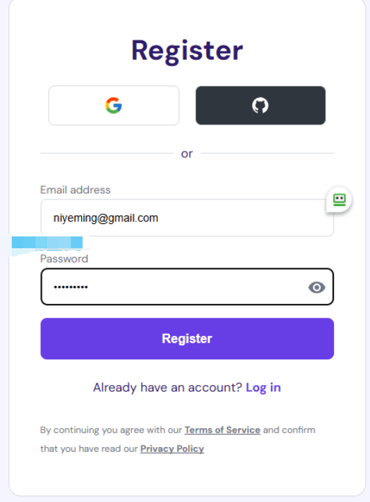 第三步:输入邮箱、密码,点击register,进行账号注册