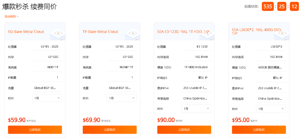 RAKsmart年末秒杀方案精选新加坡、日本和西雅图机房的高性价比裸金属和站群服务器,新加坡裸机云服务器V2^E5 – 2620、V2^32G、HDD^1T配置价格低至$59.9/月;日本裸机云服务器V2^E5 – 2620、V2^32G、NVME^1T方案低至$69.9/月;美国西雅图站群服务器E3-1230和L5630*2方案低至$90/月,所有秒杀产品续费同价,每日限量20台,每个用户当月限购5台,先到先得,售完即止!