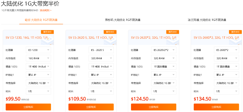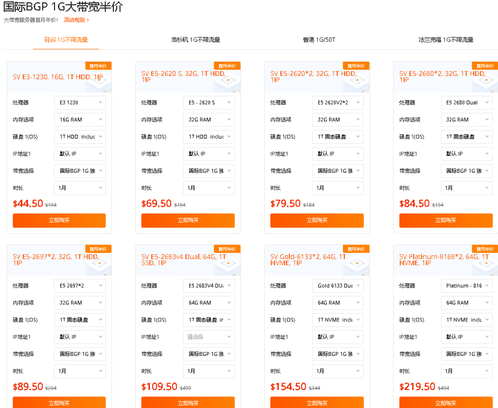 以下列出方案为部分热销配置,涵盖硅谷、洛杉矶、香港和法兰克福数据中心,其中硅谷、洛杉矶和法兰克福大带宽不限流量,香港为50T流量限制,首月价格低至$44.5。带宽为国际BPG 1G独享,支持扩展至2G。