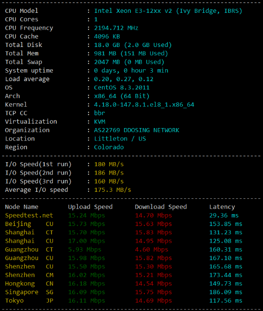 三网强制走联通AS4837线路,KVM虚拟化,NVMe阵列,最高带宽可达1Gbps,默认分配一个双ISP的IPv4(美国原生IP)。