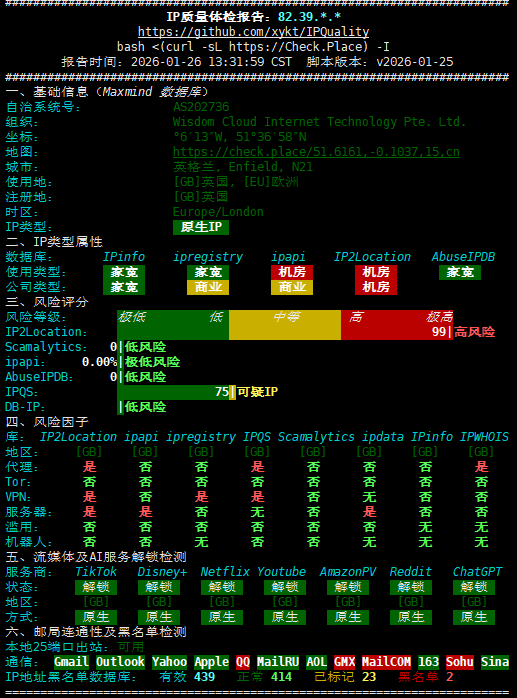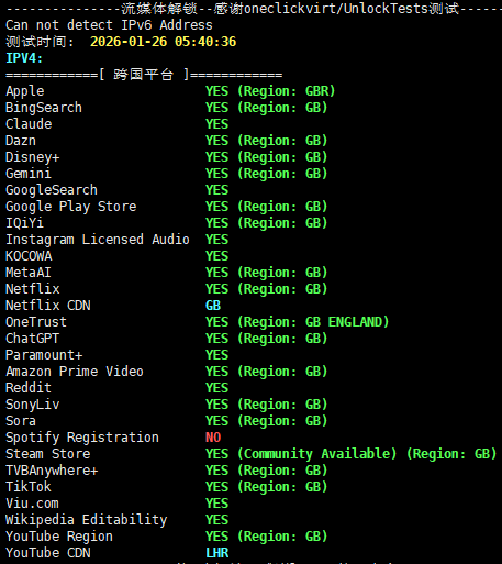 IP为英国原生,具有ISP属性,流媒体解锁的效果还可以,目前来看回程的路由不算特别差