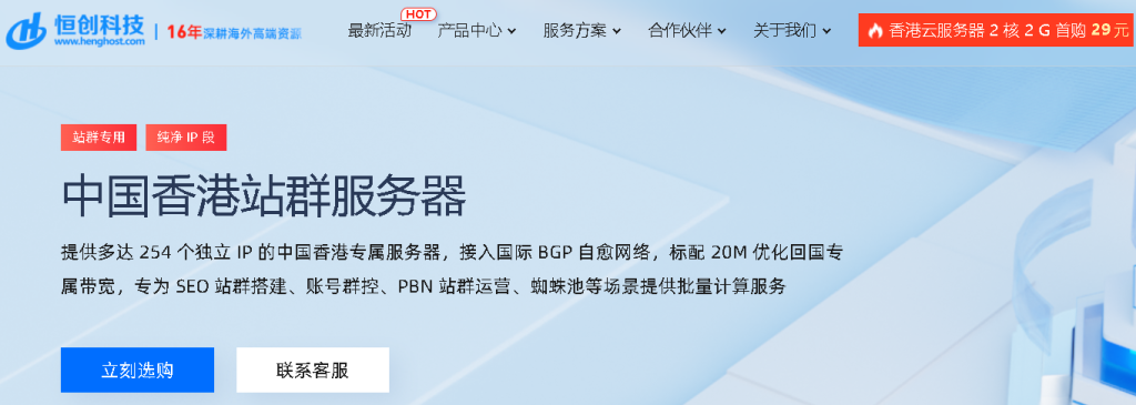 香港站群服务器免备案搭建方便,避免了每个网站都备案的麻烦,服务器部署之后就能够立即搭建业务。而且,恰逢恒创科技活动期间,现在购买价格也比较便宜。