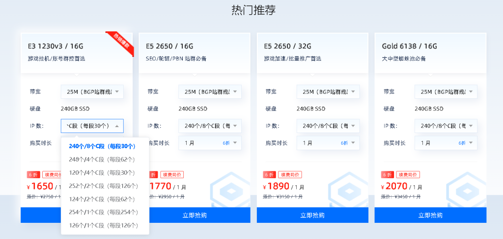 跳转页面后,如下所示,查看相应的套餐,可以看到支持的IP还是非常多的,选择自己需要的配置就可以了。