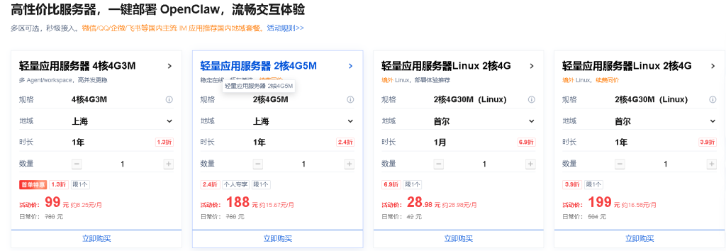 如上图所示,腾讯云的OpenClaw教程是很全的,建议大家选择一台腾讯云2核4G轻量云主机,买一年价格是188元,也可以选择99元服务器,大家根据实际情况选择。