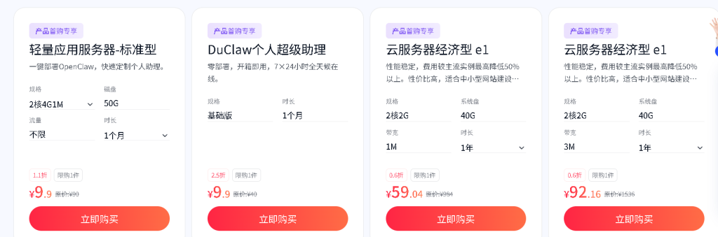 OpenClaw(原Clawdbot/Moltbot)是一款实用的个人AI助理,能够24小时响应指令并执行任务,如处理文件、查询信息、自动化协同等。云端养龙虾爆火,云端安装OpenClaw(龙虾AI)选哪家?阿里云、腾讯云、京东云和百度云等云厂商均提供OpenClaw龙虾一键部署安装,在云服务器上安装OpenClaw最低9.9元1个月、38元一年,因为OpenClaw爆火时间很短,可能会存在安全隐患,所以不建议把龙虾养在自己的本地电脑,以免产生数据泄露等安全隐患,可以部署在云端,价格优惠,几十元即可搞定: