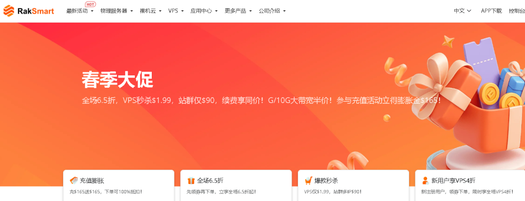 Raksmart怎么样,Raksmart优惠码是什么?Raksmart好用么?RAKsmart是知名的美国服务器租用商,遍布全球30+地区,提供物理机、裸机云、云服务器/VPS、大带宽、高防、站群服务器等产品。在全球拥有多节点, 低至月付 $3.24,支持按时计费,全场6.5折!充值得膨胀金$165!
